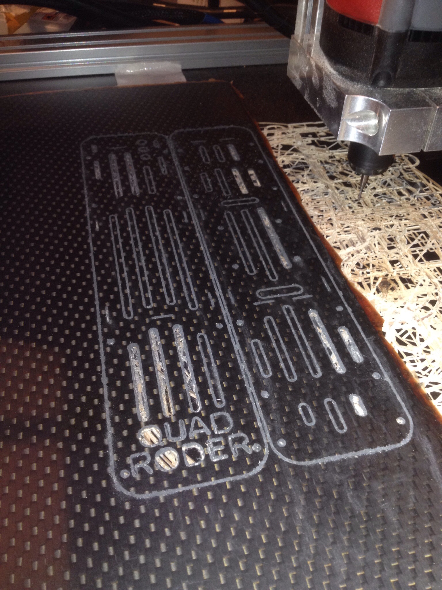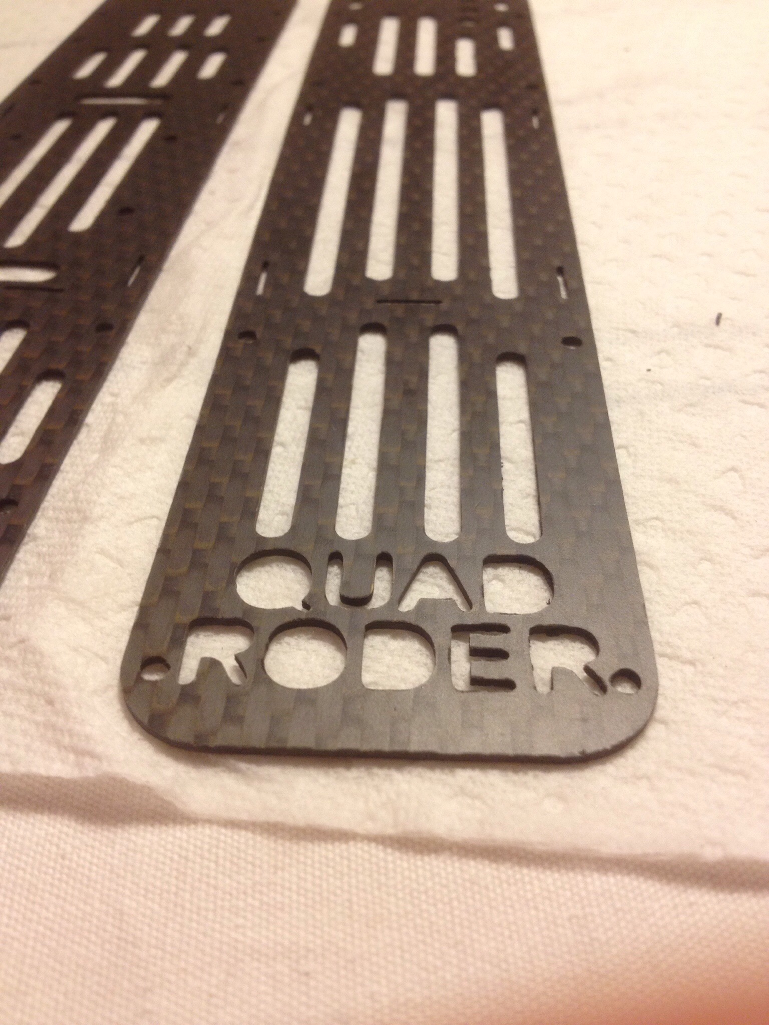 Um etwas Gewicht zu sparen habe ich mich für 1mm Carbon bei den Basisplatten und 2mm für die Motoraufnehmer entschlossen. Die Motoraufnehmer habe ich so konstruiert, dass sie 5" als auch 6" Rotorblätter halten können, ohne dass die Rotoren den Rahmen berühren. Für den Rahmen selbst habe ich Gummipuffer mit 6mm M3 Gewinde auf beiden Seiten verwendet und überall Stoppmuttern angebracht, wo Platz dafür war. Für den Rahmenaufbau selbst habe ich 40mm Distanzhülsen aus Polyamid verwendet, damit ich etwas Platz für die Elektronik habe. Die Carbon Platten habe ich bei Hadeg Recycling bestellt, die dafür bekannt sind Carbonplatten zu recyceln und neu zu verkleben. Positiver Nebeneffekt: Die Platten sind, verglichen mit den Preisen z.B. auf Ebay um einiges günstiger. Hier und da liest man, dass die Genauigkeit etwas zu wünschen übrig lässt. Damit hatte ich aber keine Probleme.